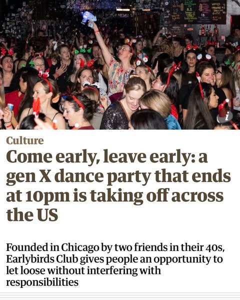 “Come early, leave early: a gen X dance party that ends at 10pm is taking off across the US.” - Lois Beckett in The Guardian. Count me in. (h/t mature.themes on Instagram.)