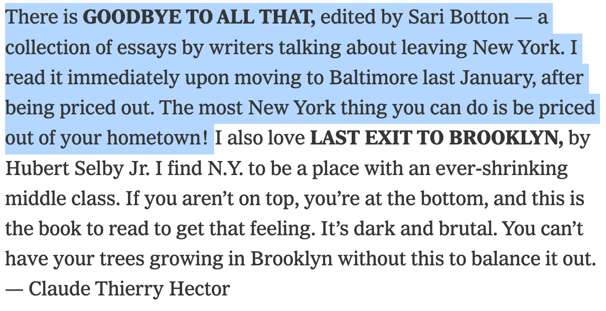 What a thrill to see Goodbye to All That: Writers on Loving & Leaving NY, an anthology I edited, in this New York Times piece on readers’ favorite New York Books! Thank you for the mention, Claude Thierry Hector.
