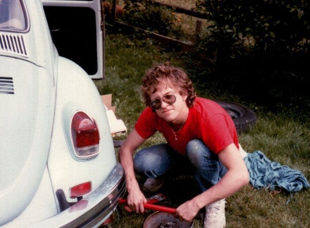Speaking of cute first cars (and cute people), here’s Brian at 18 in 1980, working on his used powder blue 1973 VW Bug. (Not sure what he’s doing to it. Maybe changing a tire? It occurs to me now that he might have a thing for light blue Volkswagens.)