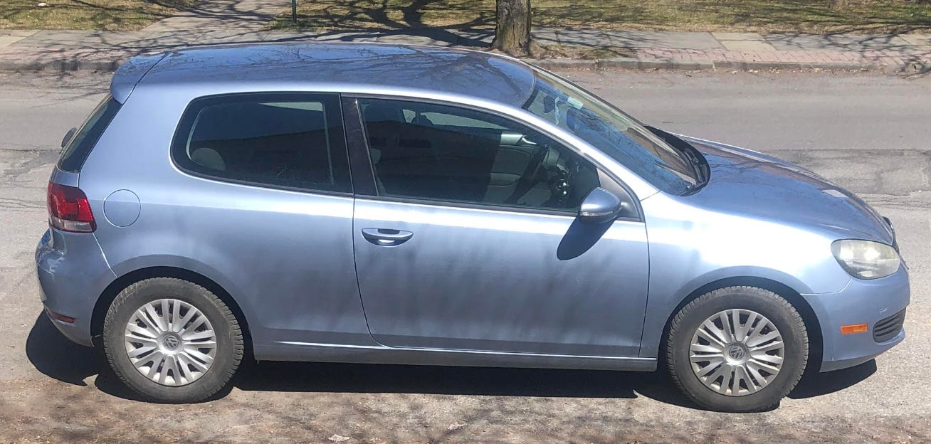 I’ve been thinking a lot about cars because soon Brian and I are going to need a new one. We love our 2010 VW Golf, which we got certified-preowned in 2013 after a collision with a deer totaled our 2007 VW Rabbit. We’ll keep the Golf—it runs great, although incidental things like the interior roof lining are deteriorating. But when Brian turns in his I.T. Guy van in July, we’ll need something new. (Probably also used, a few years old, and certified-preowned.)