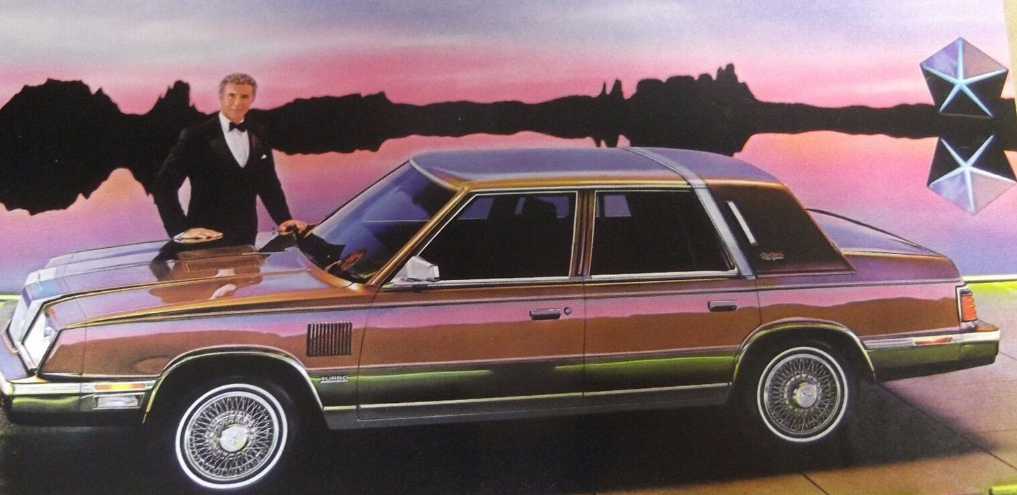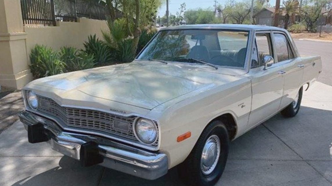 I got my permit in 1981, and my license in 1982, and learned to drive on my mom’s beige 1973 Dodge Dart, which looked very much like the photo up top. It was another instance of an aging car running well while incidental things started going on it. You know, little things like door latches—at the end of that car’s life if you turned right, the passenger door flew open; if you turned left, the driver door flew open. Once, when I was driving on a highway in the pouring rain, the mechanism that makes the windshield wipers work suddenly stopped functioning altogether. But the car still drove reliably, and like a dream.