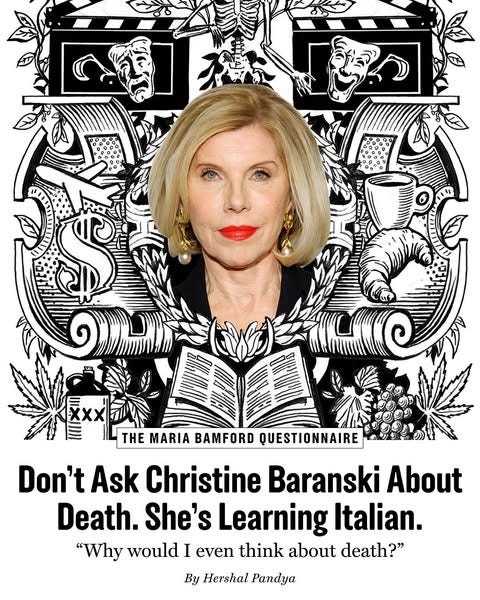 Christine Baranski Fears a New York City Death—But she hopes to play Lawrence of Arabia before that happens. - In Vulture/NYMag, the prolific actress—currently starring in The Gilded Age—takes The Maria Bamford Questionnaire.