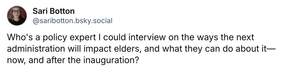 Lacking any real understanding about what might happen and what we can do about it only added to my anxiety. So I decided to seek more informed answers from a policy expert. I put out a query on BlueSky, and it led me to wonderful Callie Freitag, Assistant Professor at the University of Wisconsin-Madison Sandra Rosenbaum School of Social Work. (Callie, it turns out, is also a long-standing Oldster subscriber.)