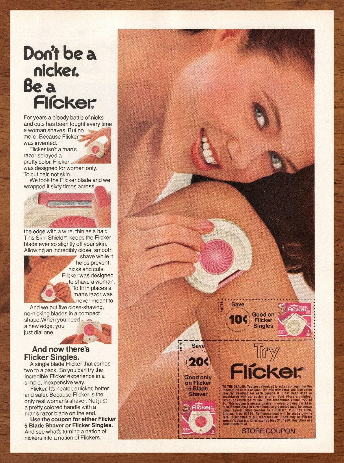 When I was my daughter’s age, the primary concern over shaving was all the nicks and cuts an inexperienced new shaver might suffer. To solve that problem, Gillette introduced what was billed as the first disposable razor for women, the “Flicker,” in 1971. A cream-colored piece of plastic with a round pink dial reminiscent of a seashell’s logarithmic spiral, the Flicker housed five blades; you got a fresh one by turning the dial, safeguarding young fingers from contact with the (not very sharp) razors. When I was 13, I started with a Flicker. I have the sharpest (!) memory of sitting next to my mother on the beige sofa in our living room, watching her run my Flicker across part of her shin. “It works even when your skin is dry,” she told me. “You can’t hurt yourself with this.”