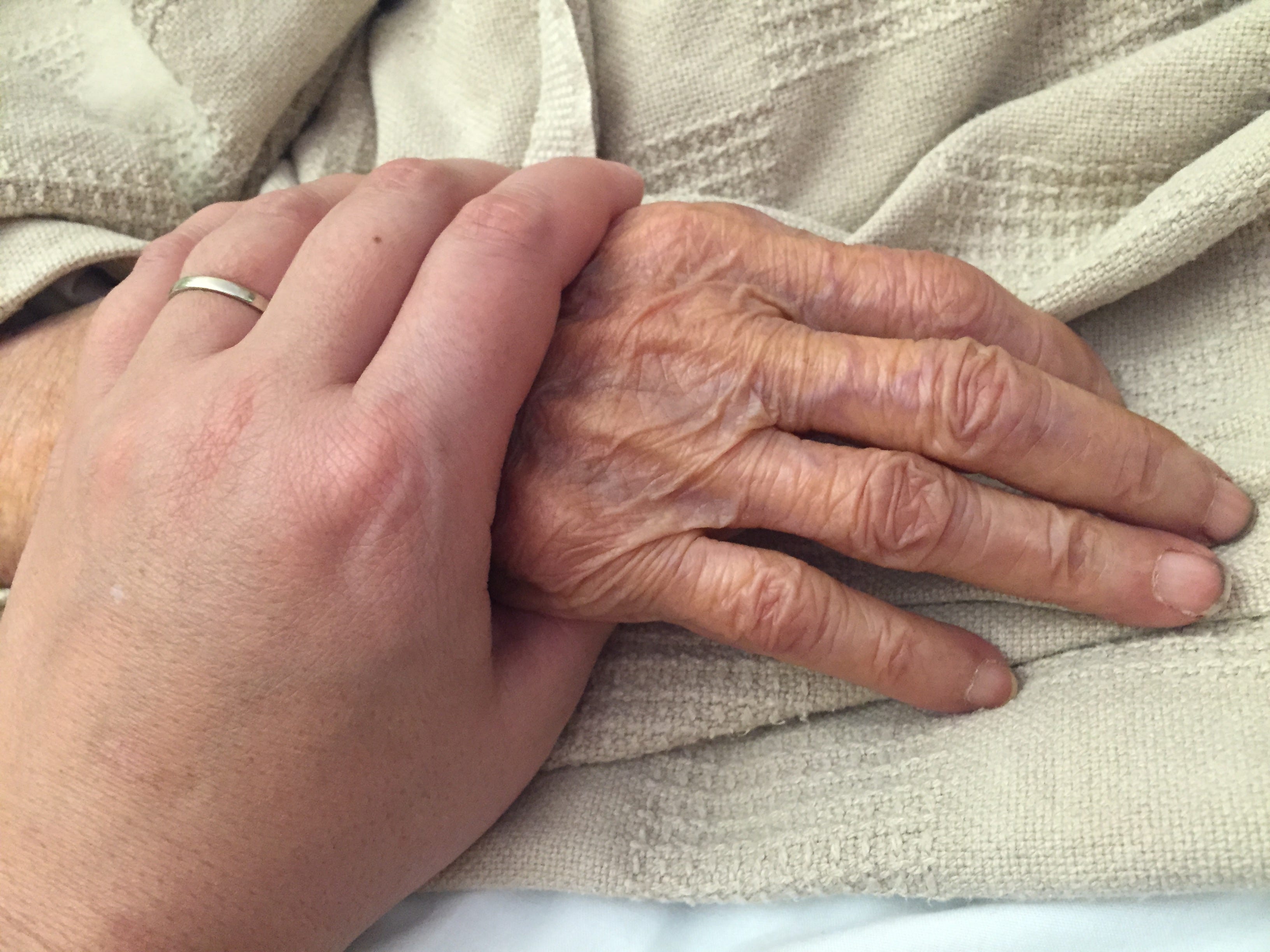 Now, I watch as the nurses come and roll Popo’s body from side to side, as they show me her rash from incontinence, and her sores. I try not to stare as they wipe her flat bottom, as I see her skin, still soft and supple, her breasts small and withered, hanging to her sides. I know how mortified Popo would have been in her younger days — or even a mere month ago — to see herself like this, barely cognizant, exposed. They show me her toes, inflamed, tell me we need to keep her feet elevated. Keep her bed at 100 degrees. Or 130. I write these things down so I can remember to tell my mother, who is due to arrive in a couple days. I watch as Popo’s arms fill with bruises after her blood transfusion. They tell me this is normal. I watch as she seems to barely breathe.