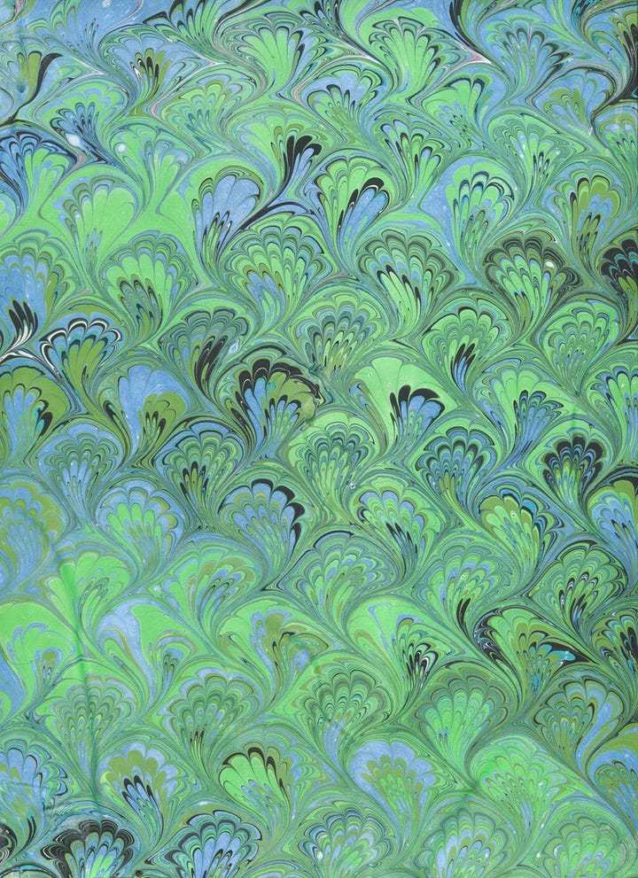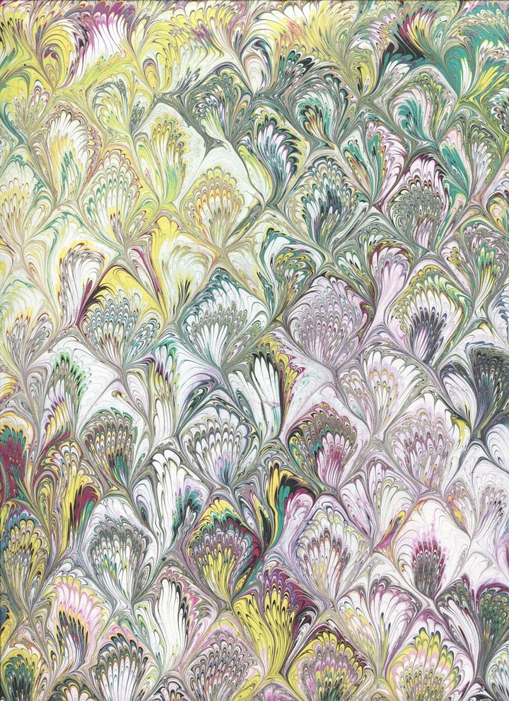 I have been marbling paper for a few years now, but I’ve never been quite certain of its “rightness.” I have assumed that the small smudges of color by the paper’s edge are proof of my amateur status. That those white dots that sometimes appear are evidence of error. That when some of the color crawls onto the back side of the page I have managed to do something shameful.