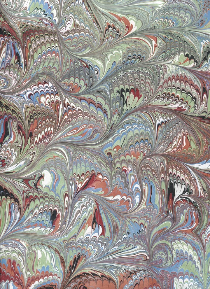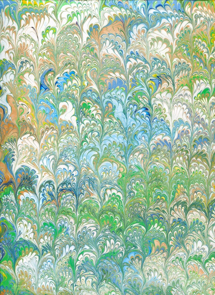 One Christmas my husband buys me marbling paints and a tray, carrageenan, alum, broom bristle tips, raking tools. The gift comes with a how-to book, and I dutifully thumb through the pictures. But then (after my husband mixes the carrageenan and the alum as I am not always the best at math) I am on my own. I am marbling paper.