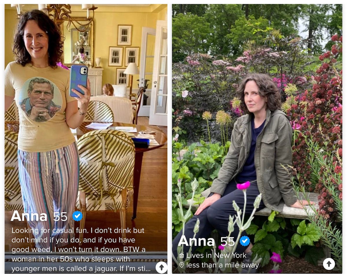 Still, there’s no escaping the message that women your age are supposed to be invisible and unfuckable. On the one hand, you are invisible in public; it’s been years since a man has told you to smile. But once you start swiping on Tinder, you’re not only seen, but desired. Sometimes, as you’re walking through your neighborhood in your standard uniform of no makeup and loose clothes, you’ll pass a cute guy and know it’s possible you could run into him on Tinder. You come to believe that this—the power to appear and disappear at will, receiving male attention only when you want it—is one of the greatest gifts the app has to offer.