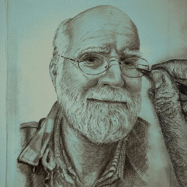 I’m enjoying perusing author Nicholson Baker’s illustrations on his Instagram. This one he’s captioned “Drawing of my hand drawing a self portrait.” :