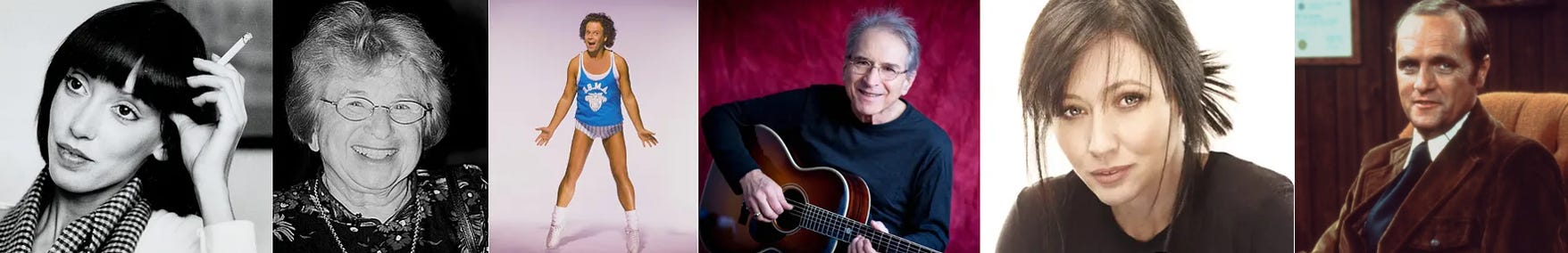 The bad news: The Grim Reaper has been on an absolute tear through the halls of fame this week. RIP: Shelly Duvall, Dr. Ruth Westheimer, Richard Simmons, Happy Traum, Shannen Doherty, and Bob Newhart.