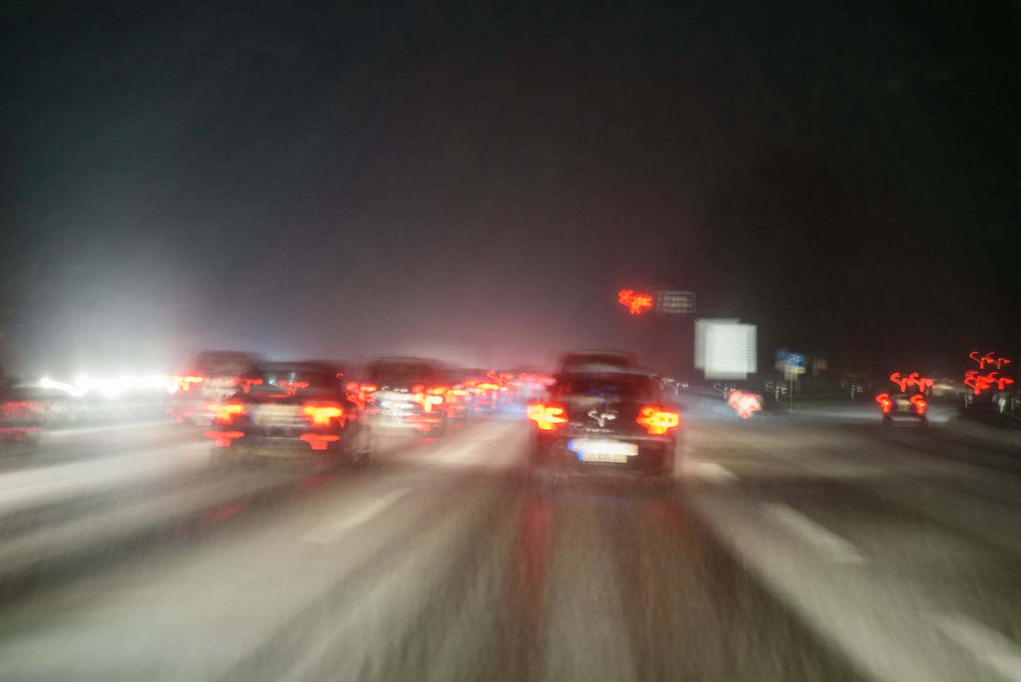 Specifically, I find it difficult to distinguish which of the many lights up ahead are near and which are far. It’s all just a canvas of darkness punctuated by random lights that all feel too bright, and whose distances I can’t determine. It’s especially bad in the summer, when there’s night construction on highways, which means even more blaring lights.