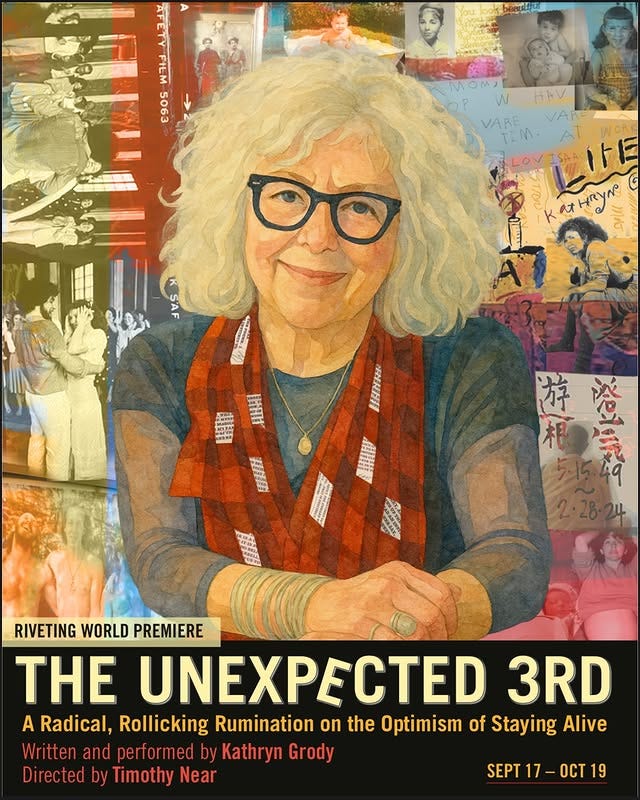 Gonna try to get to People’s Light theater in Malvern, PA sometime between September 17th and October 19th, when friend of Oldster Kathryn Grody performs her one-woman show, The Unexpected 3rd, “a radical, rollicking rumination on the optimism of staying alive.”