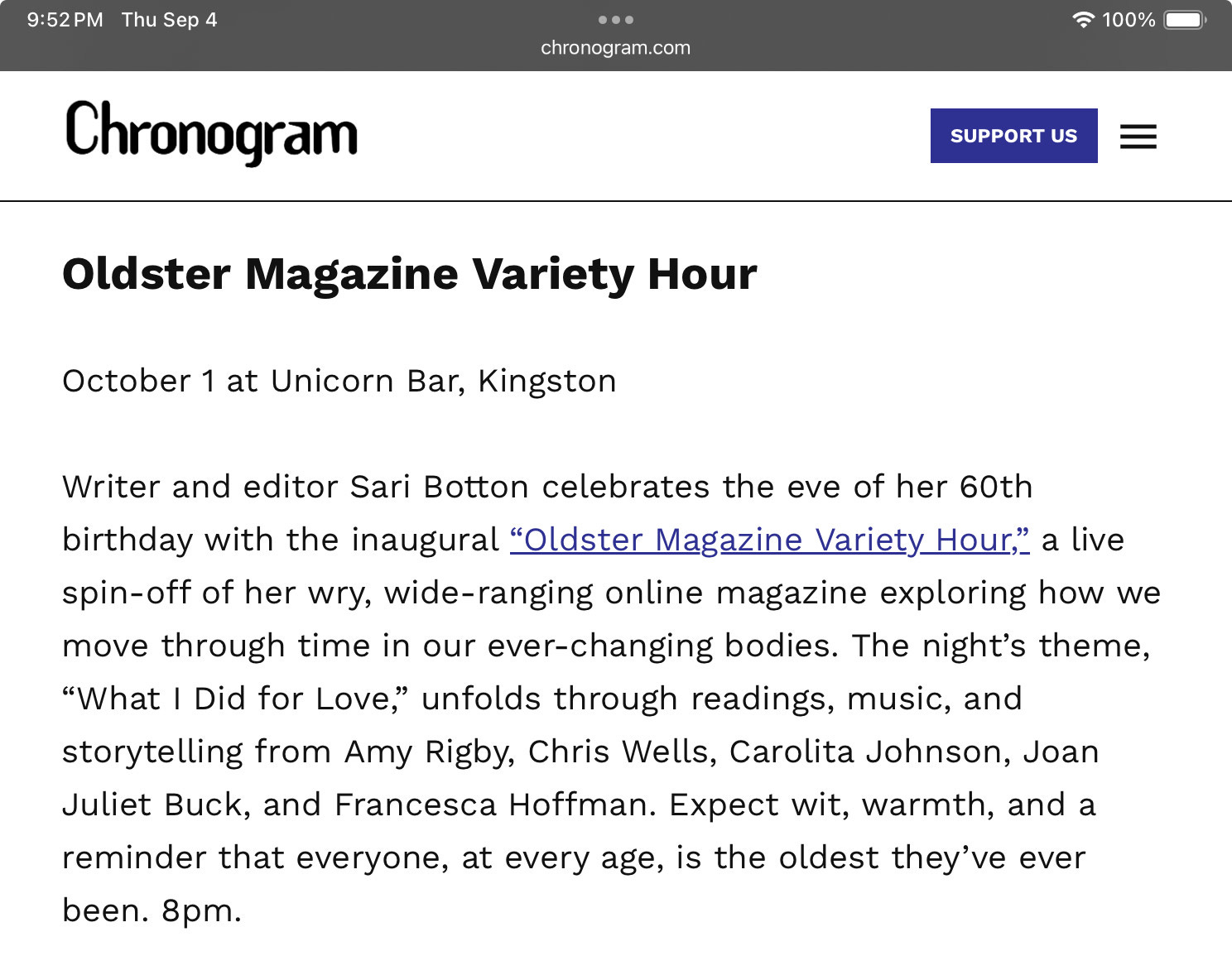 Now through my 60th birthday on October 2nd, save 10% off Oldster’s already low subscription rates of $55/year and $6/month. After that, prices go up to (the still pretty reasonable rate of) $60/year and $7/month. Thanks to all who already support my work here! 🙏 I’m grateful. - Sari Botton