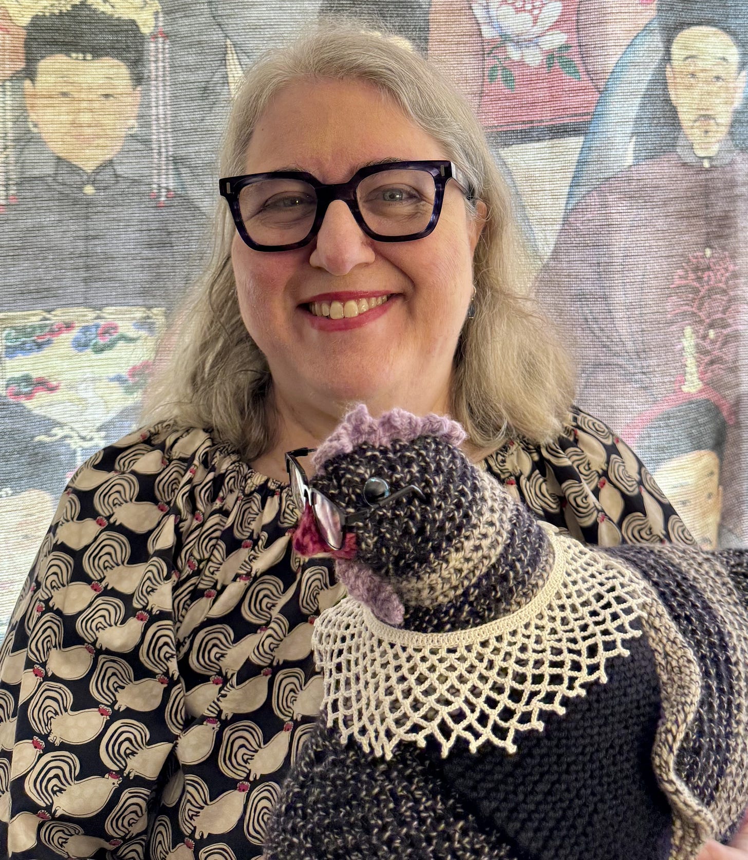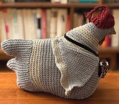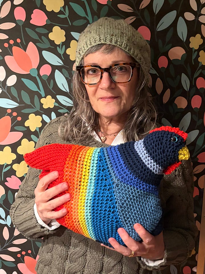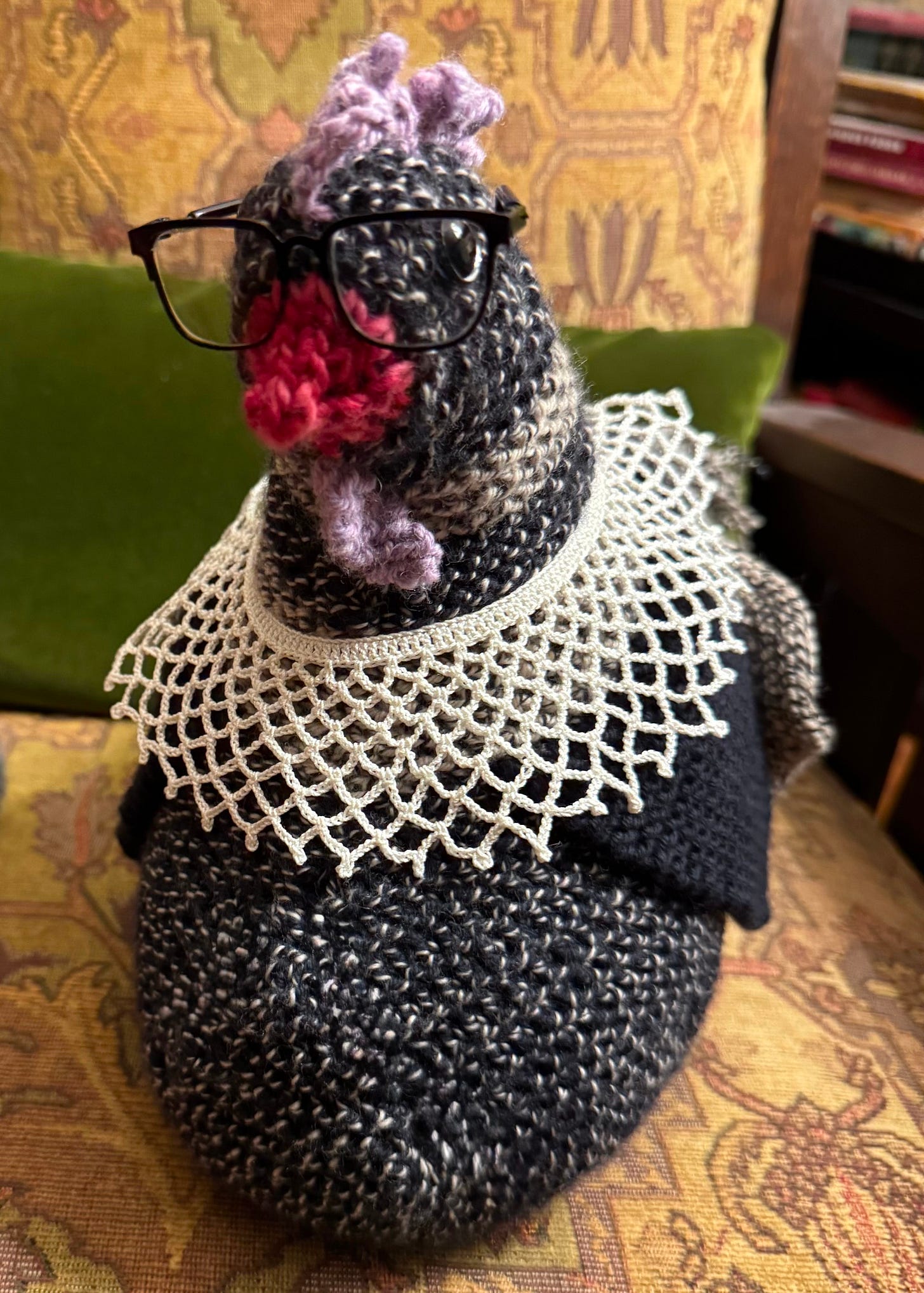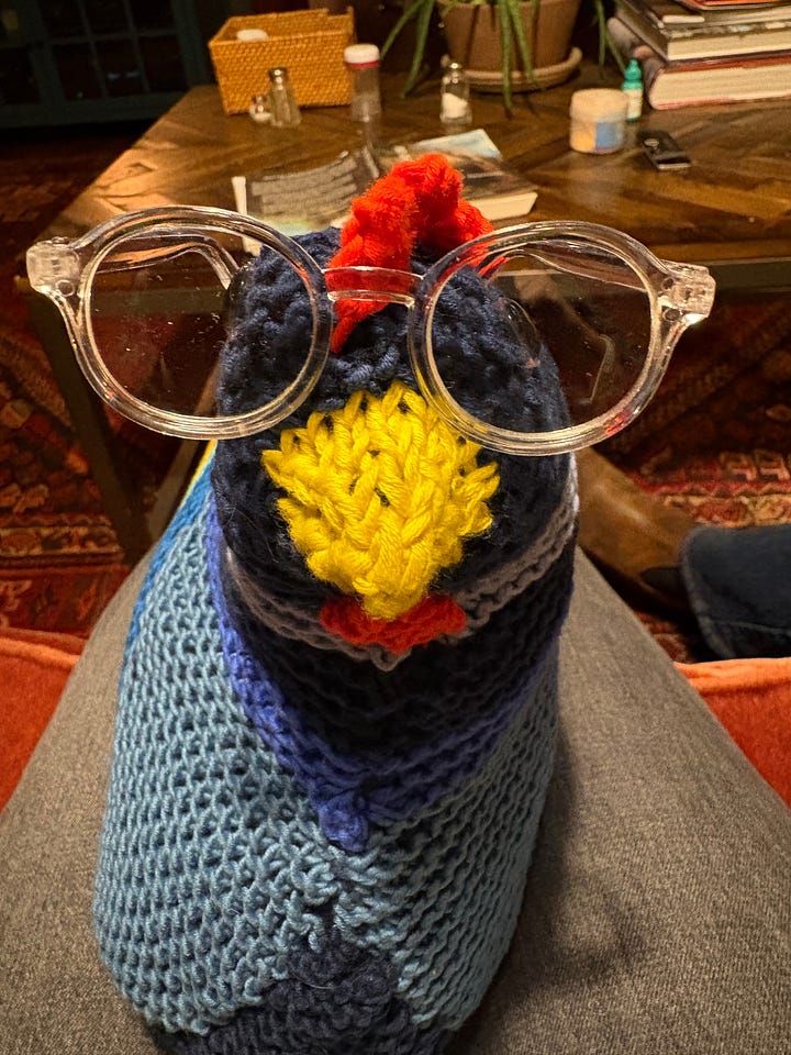 I just finished a chook for myself, Ruth Bader GinsBird—complete with tiny metal spectacles and a crocheted dissent collar—to reassure me that the rule of law will survive. This notorious little chicken makes me feel brave. Perhaps I’ll knit an entire avian Supreme Court to tide me over until the real one returns to order.