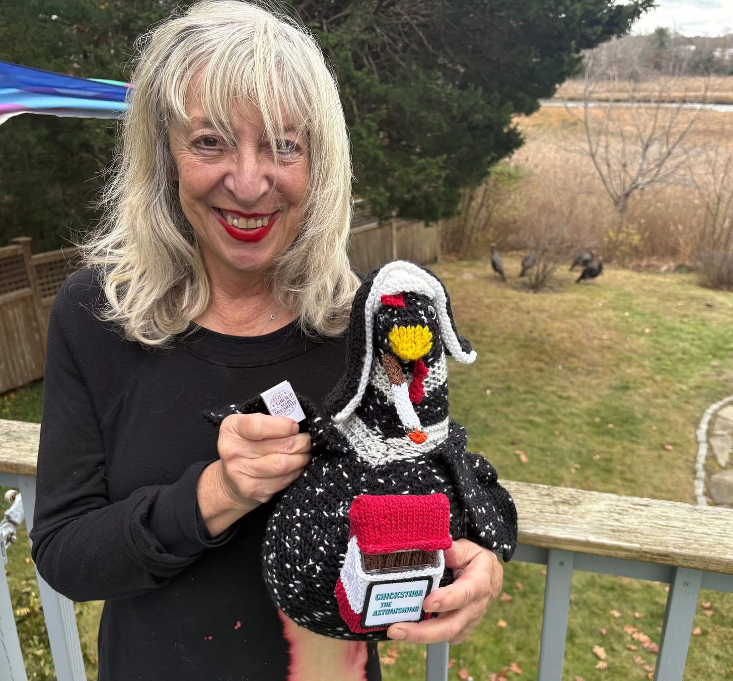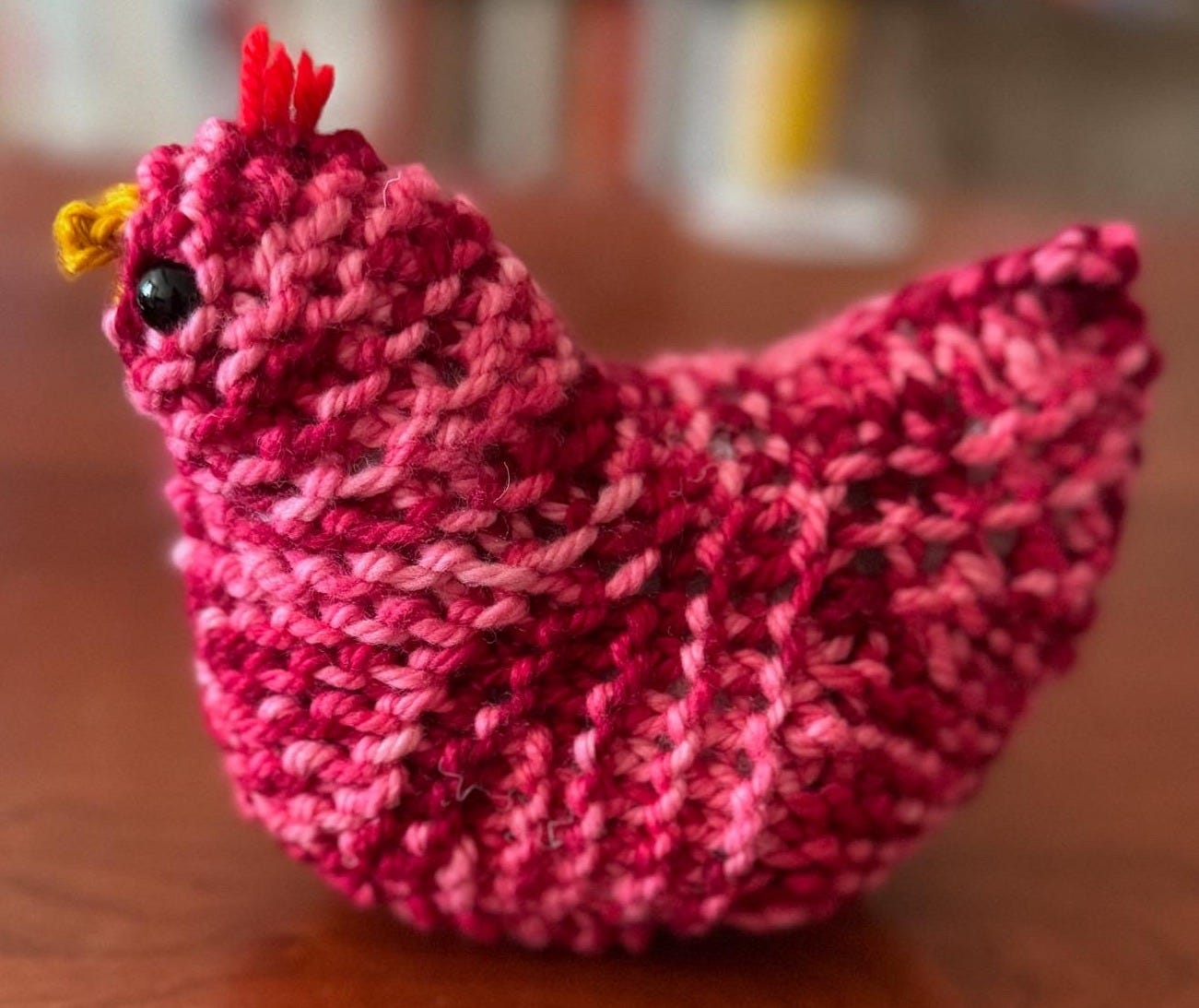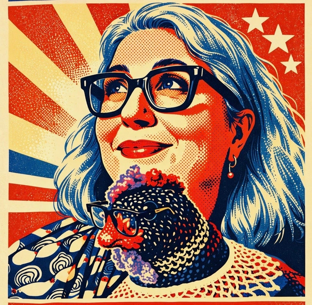 I just finished a chook for myself, Ruth Bader GinsBird—complete with tiny metal spectacles and a crocheted dissent collar—to reassure me that the rule of law will survive. This notorious little chicken makes me feel brave. Perhaps I’ll knit an entire avian Supreme Court to tide me over until the real one returns to order.