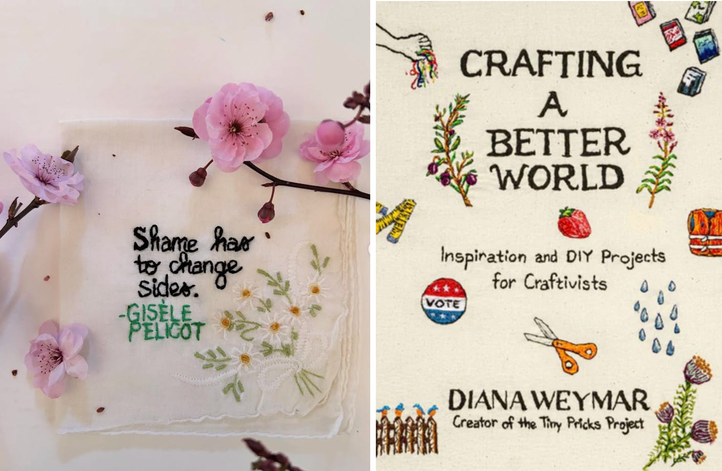 I know a lot of people who are turning to “craftivism” these days, as a way to calm their nerves through our unprecedented political moment, and to make statements with the end products. Diana Weymar comes to mind—author of Crafting a Better World: Inspiration and DIY Projects for Craftivists, and founder of Tiny Pricks Project, though which she emboriders inspirational and political sayings.