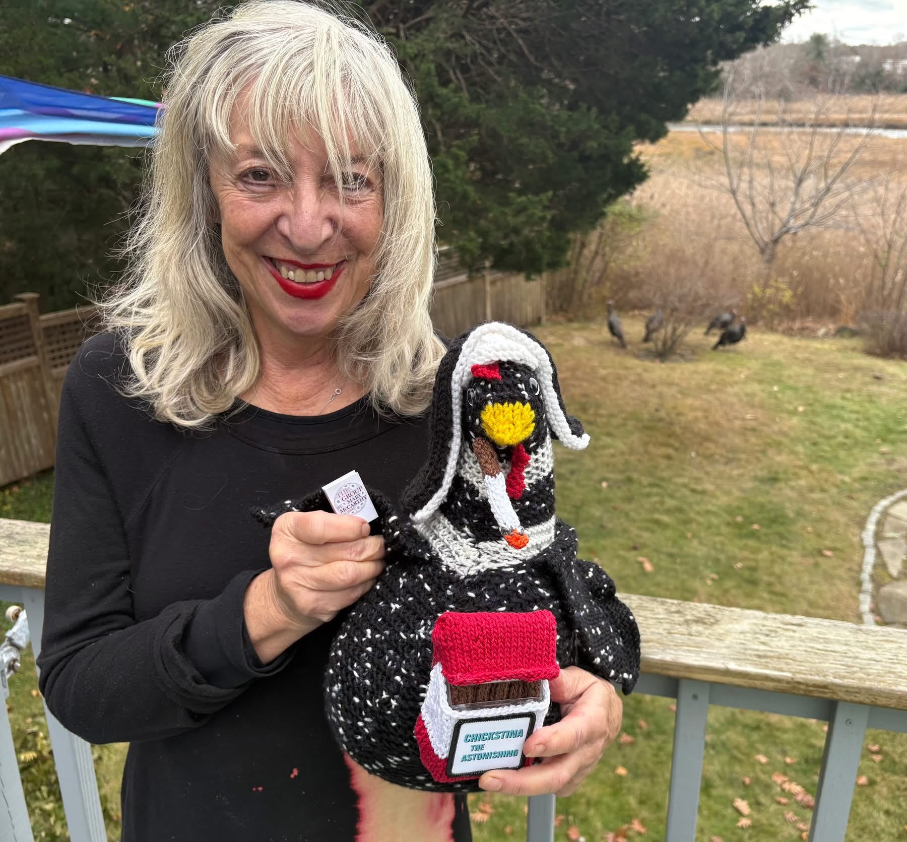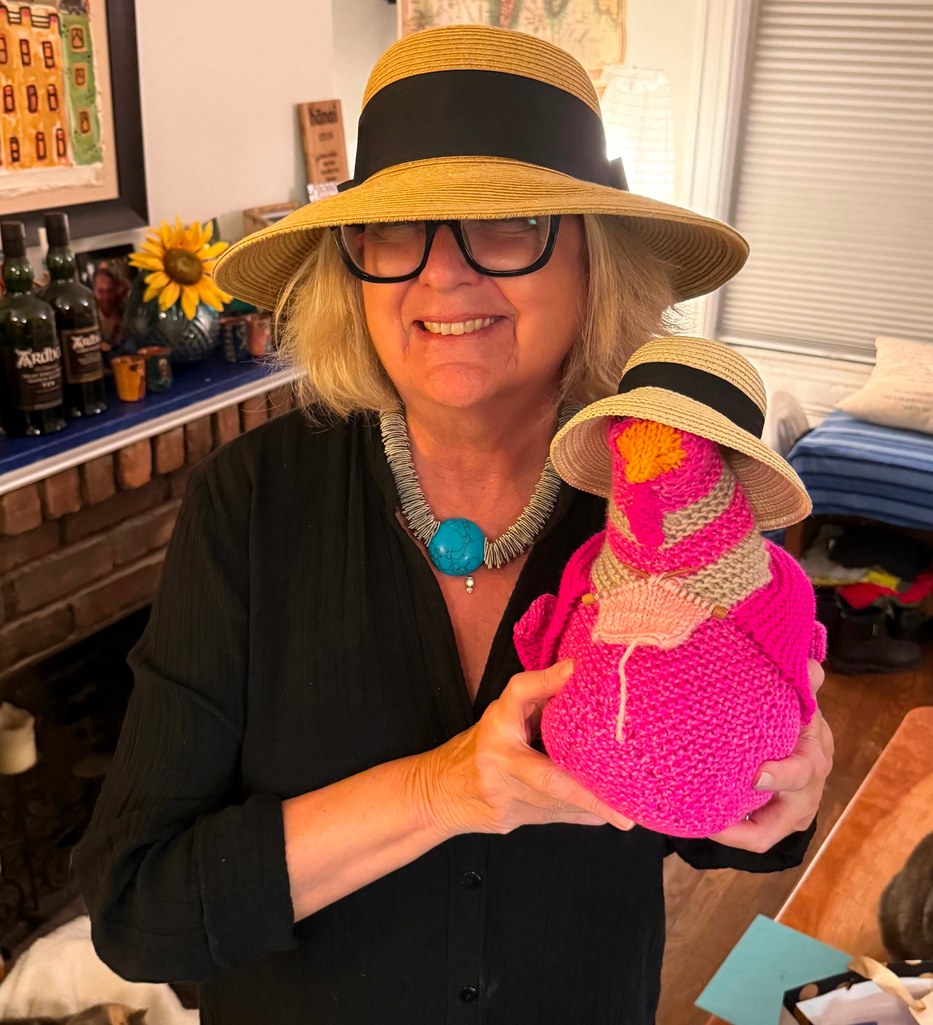 I’ve discovered a similar sense of community in writing workshops. For my friend and writing teacher Ann Hood, a voracious knitter and traveler (and author of Fly Girl), I crafted “Hen Hood,” a hot pink doppelgänger sporting tiny knitting needles and a traveling hat.