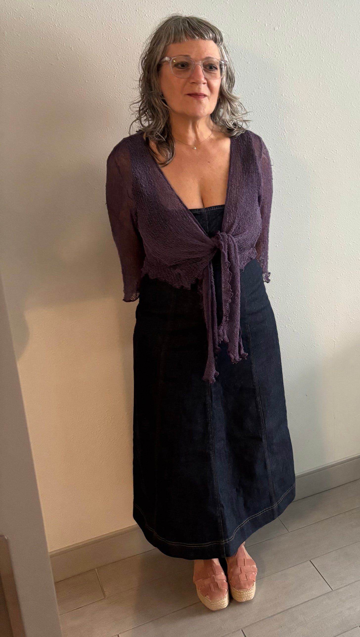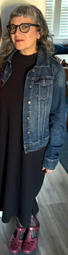 I think about that post a lot these days, because I harbor this notion that once I turn 60, I’m supposed to start dressing like A Real Grownup Lady™. Like, it’s my duty to adopt a more formal look—smart skirt suits, crisp blouses, gabardine slacks, tea-length dresses—but also loose, shapeless linen outfits in muted tones that don’t call attention to the ever-increasing softness of my body and the changes in my shape.
