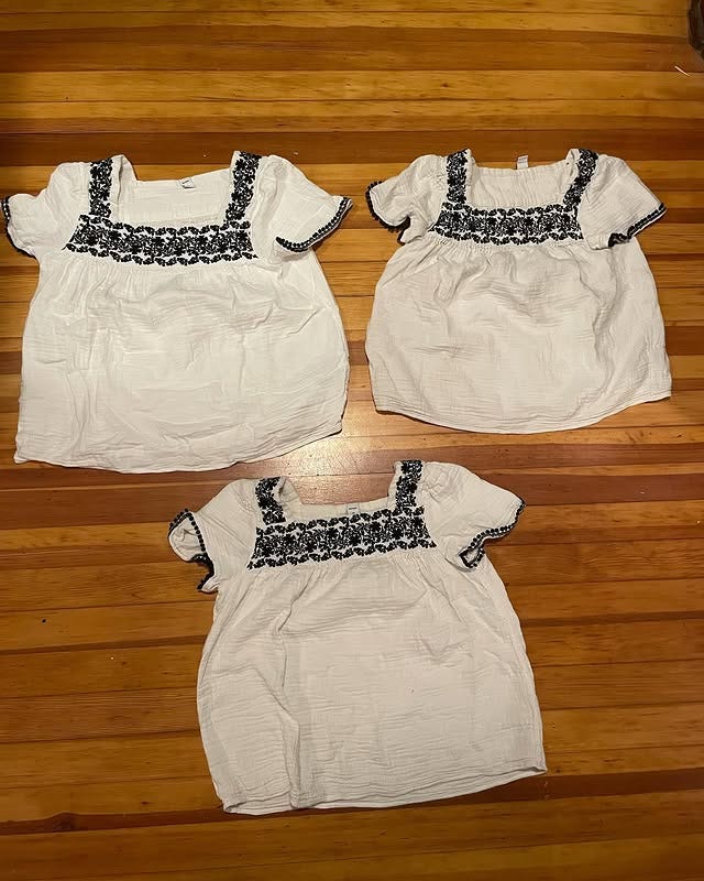 My closet is filled with lots of old Levi’s 501s—both full-length and cut-off—although also some Universal Thread skinny-jeans; Gap chinos and thrift-store army pants; empire- and babydoll-cut cotton dresses reminiscent of those made by the Street Life brand I bought at NYC flea markets the Y2K era; skirts that hit just above the knee (I’ve finally ditched the super short minis); clogs (although rarely wooden ones anymore, thanks to arthritis); fisherman sandals; Blundstone and old Frye boots; basic cotton short- and long-sleeved tees; tuxedo-style blouses with pin-tucked fronts; classic blazers; menswear vests; and peasant shirts—like this one that I loved so much, I bought three of them (I’ve since given one to a friend):