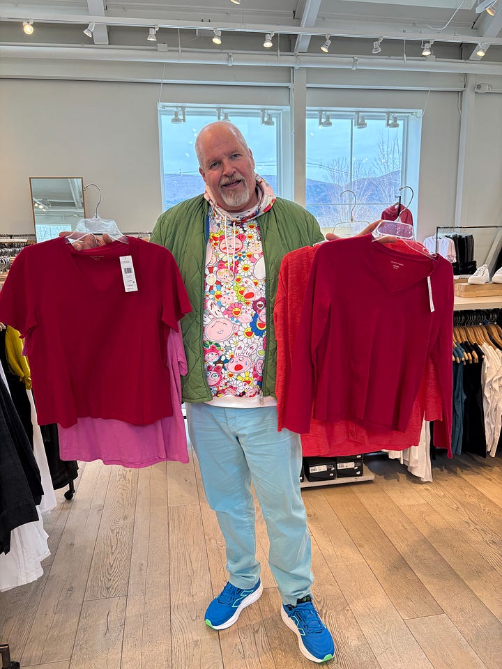 My first stop was an Eileen Fisher discount outlet in Manchester Vermont, where, in late March, I led a personal essay workshop at the Southern Vermont Writers’ Conference. (I’ll be back there next year. Stay tuned for details.) My friend Chris Wells was leading a workshop there, too, and his husband, painter Bobby Lucy, was along for the ride. They were only too happy to give me the Queer Eye treatment.