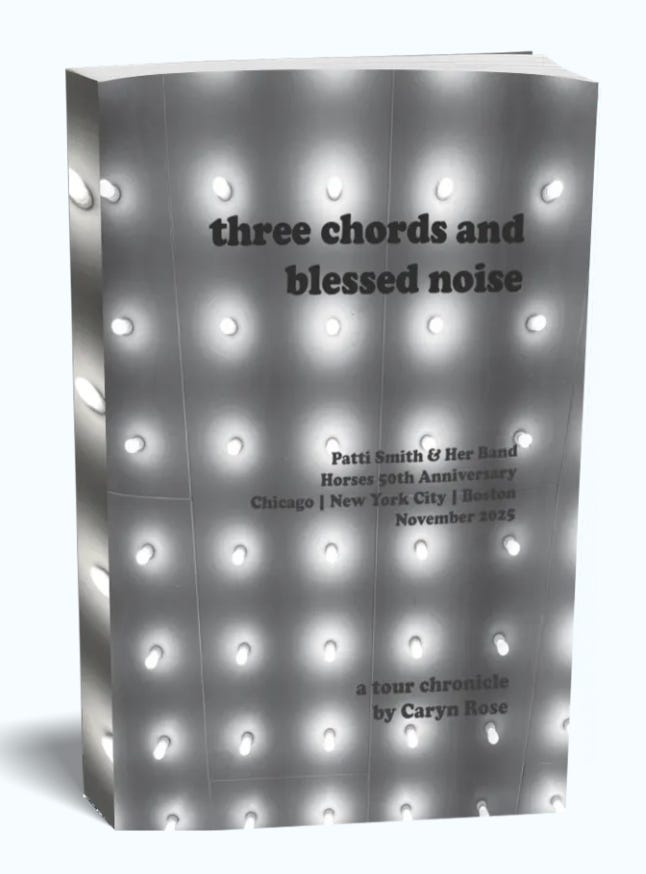 Why Patti Smith Matters author Caryn Rose—who wrote “Patti Smith Only Cares About Doing the Work” for Oldster—has just published Three Chords and Blessed Noise, a chapbook about covering last year’s 50th anniversary tour for Smith’s seminal record, Horses.