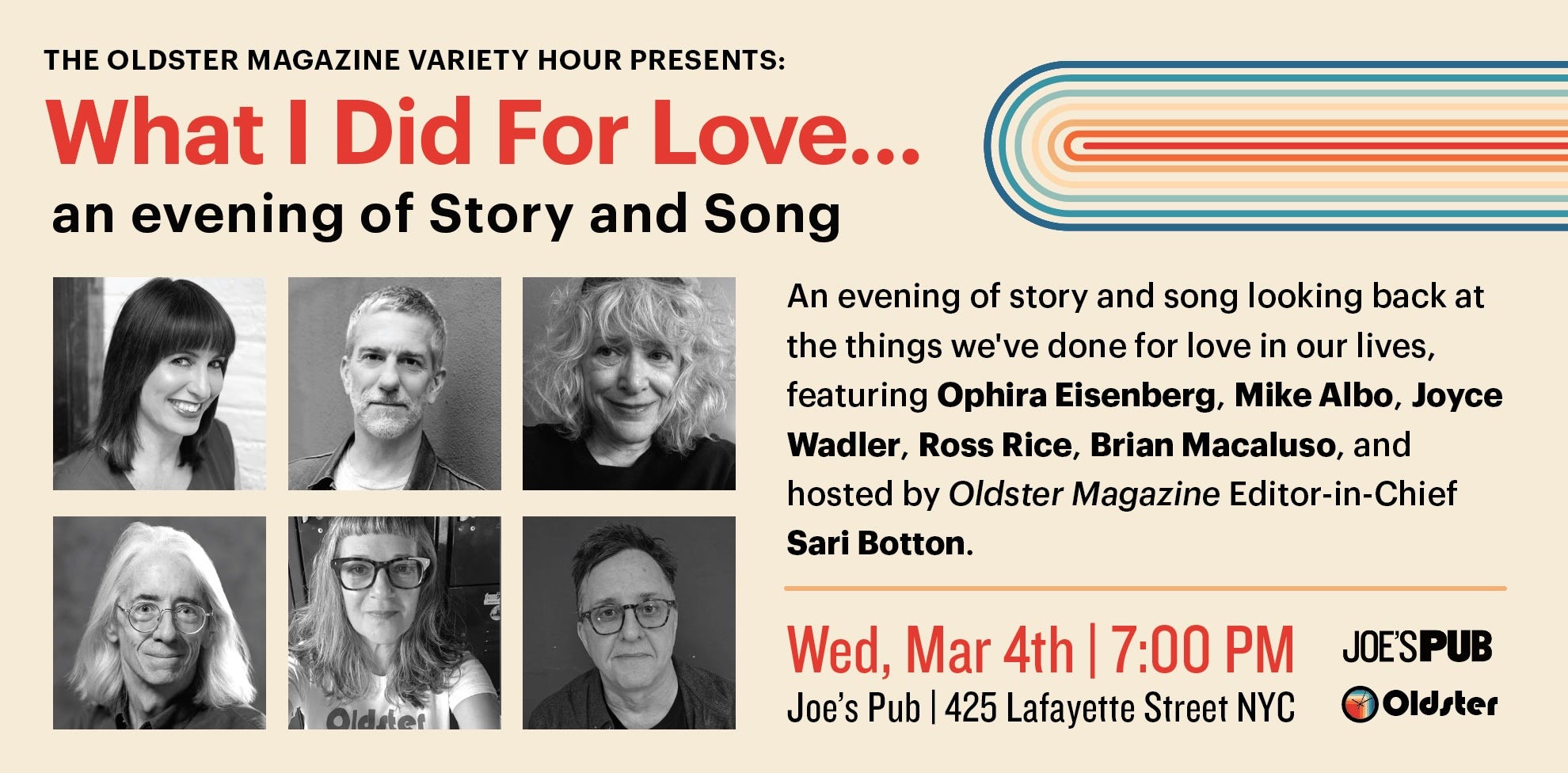 Hey, now you can watch The Oldster Variety Hour on March 4th at Joe’s Pub, OR from the comfort of your home, where ever that may be. Get yourself a remote video ticket for just $10, and watch it either live, or on your own time for up to a week later.