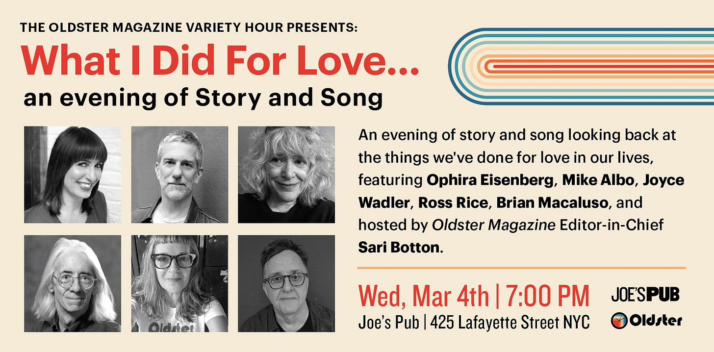 A tremendous amount of work goes into publishing Oldster—mine, and that of my contributors. Paid subscriptions keep Oldster going, and allow me to keep paying essayists and interviewers. Thanks to all who support my work here! 🙏